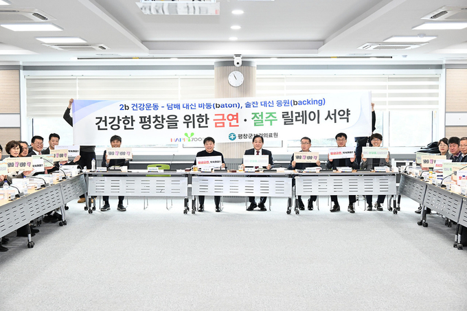 [뉴시니어 = 노태영 기자] 강원 평창군(군수 심재국)은 9일 2b 건강 운동 담배 대신 바통(baton), 술잔 대신 응원(backing) 슬로건 아래 금연, 절주 실천 서약식을 진행하며 건강한 조직문화 조성과 지역사회 건강 증진을 위한 금연·절주 실천 서약 릴레이를 추진한다고 밝혔다.