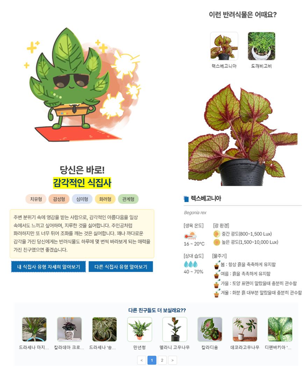 예를 들어 우울감 해소에 도움이 되고 따뜻한 느낌의 반려식물을 원하는 성실한 식집사에게는 베고니아, 벤자민 고무나무 등을 추천하고, 공기정화 효과가 있고 단정한 느낌의 반려식물을 선호하는 은은한 식집사에게는 율마 등의 반려식물을 추천하는 방식이라고 농진청은 설명했다.
