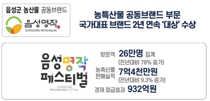 특히 통합 농산물 축제인 ‘음성명작페스티벌’은 전년 대비 78% 증가한 26만 명의 방문객을 유치하고, 932억 원의 경제 파급효과를 기록하며 대한민국 대표 농산물 축제로 자리매김했다.