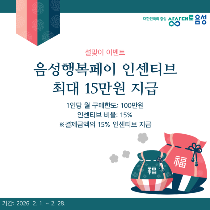 [뉴시니어 = 노태영 기자] 충북 음성군(군수 조병옥)은 설 명절을 앞두고 역외 소비 유출 방지와 지역경제 활성화를 위해 음성행복페이 1인 인센티브 비율을 15%로 상향 운영한다고 27일 밝혔다.