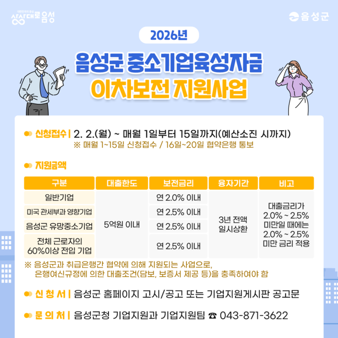 [뉴시니어 = 노태영 기자] 충북 음성군(군수 조병옥)은 저금리 정책자금 지원을 통해 관내 중소기업의 유동성 확보를 도모하고, 고금리 장기화에 따른 기업의 금융비용 부담을 완화하기 위해 2026년 음성군 중소기업육성자금 이차보전 지원사업을 오는 2월부터 본격 추진한다고 28일 밝혔다.