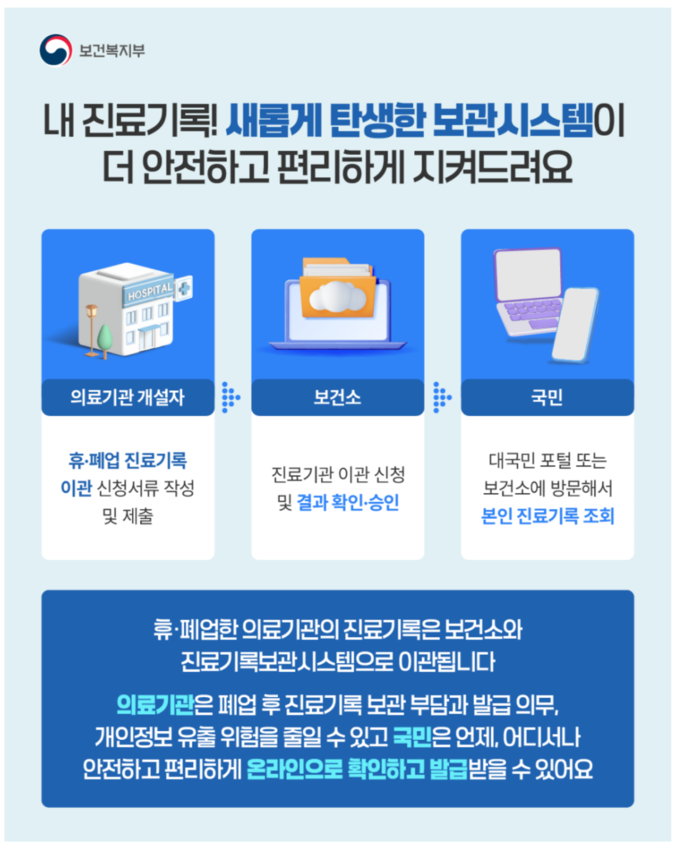 휴,폐업 의료기관 진료기록보관시스템은 병원이 문을 닫아도 진료기록을 국가가 안전하게 보관하고, 국민이 필요할 때 해당 기록을 열람하거나 사본을 발급받을 있도록 지원하는 시스템으로, 지난해 7월 21일부터 본격적으로 서비스를 시작했고, 이후 약 700개 의료기관의 진료기록을 보관하고 있으며, 현재까지 약 3만 건의 진료기록 사본 발급을 지원했다고 복지부는 설명했다.