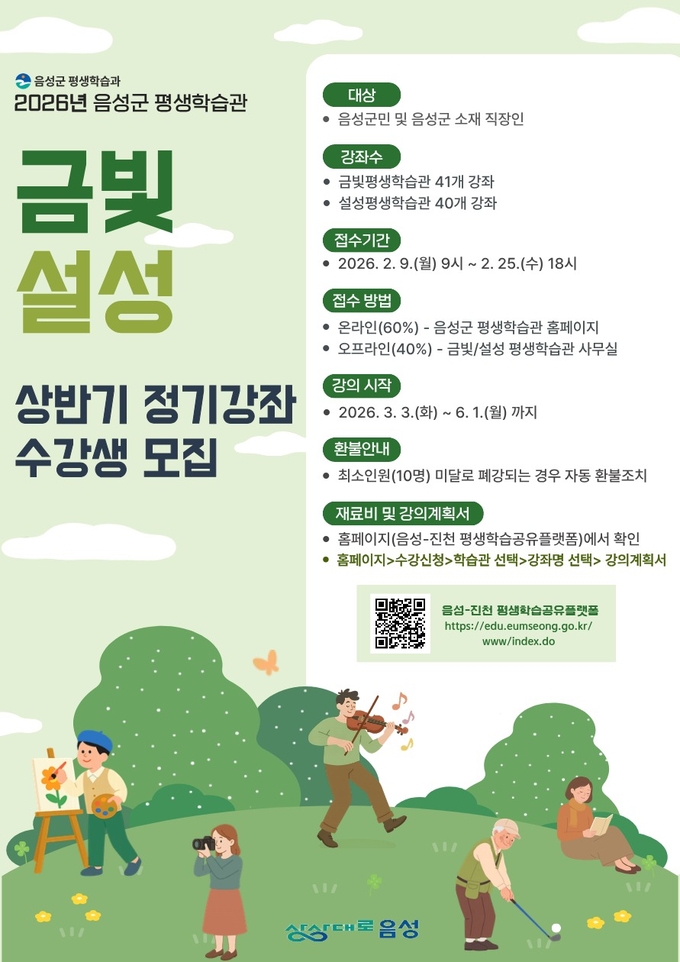[뉴시니어 = 노태영 기자] 충북 음성군(군수 조병옥) 평생학습관(금빛·설성)에서 2026년 상반기 정기강좌 수강생을 모집한다고 5일 밝혔다.