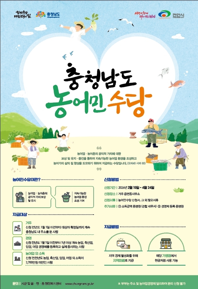 신청 대상은 2025년 1월 1일 이전부터 충남도 내에 주민등록을 두고, 같은 기간 농어업 경영체 등록을 유지하고 있는 농어민으로 2024년 기준 농어업 외 종합소득금액이 3,700만 원 이상인 사람은 제외된다.