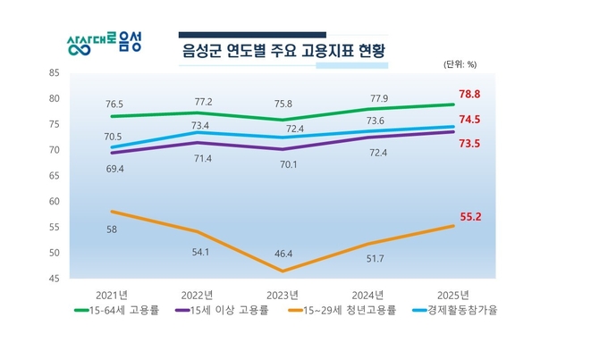 [뉴시니어 = 노태영 기자] 충북 음성군(군수 조병옥)은 국가데이터처(처장 안형준)에서 발표한 2025년 하반기 고용률 4개 분야에서 충북 도내 1위를 기록하며, 그간 추진해 온 일자리 정책이 가시적인 성과를 거두고 있는 것으로 나타났다고 25일 밝혔다.