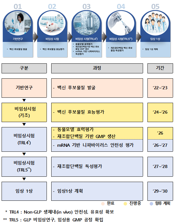 올해는 니파바이러스 백신 후보물질에 대한 동물모델 효력평가, GMP 생산 공정 확립을 본격 추진 중이고, 이후 안전성 평가(2027~2028년)와 임상 1상 시험(2029~2030년)을 거쳐 국산 니파바이러스 백신을 확보하는 것이 목표라고 질병청은 전했다.