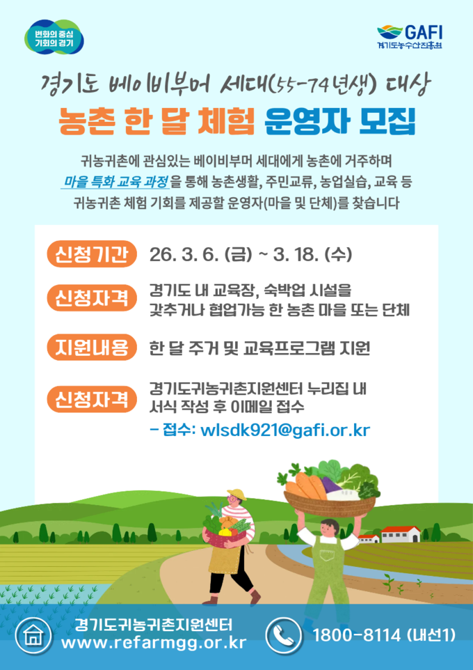 [뉴시니어 = 노태영 기자] 경기도(도지사 김동연)와 농수산진흥원은 도 베이비부머 농촌 한 달 체험을 운영할 마을·단체 2곳을 오는 18일까지 모집한다고 6일 밝혔다.