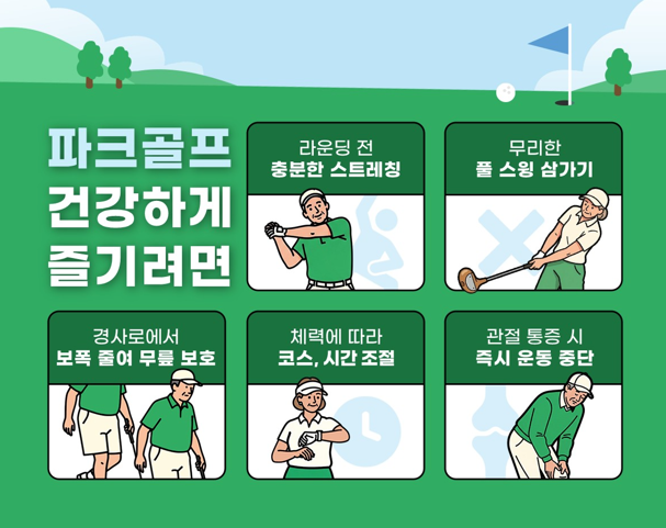 경사진 코스를 걸을 때는 보폭을 줄여 무릎 관절에 가해지는 하중을 줄이고, 평소 무릎이 좋지 않다면 보호대를 착용하는 것도 도움이 된다. 공을 칠 때는 허리를 과도하게 숙이거나 펴지 않도록 주의하고 시선은 공을 끝까지 주시해 경추 비틀림을 방지하는 것이 좋다.