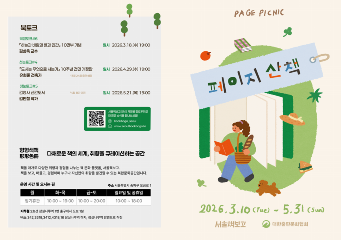 서울책보고는 책과 함께하는 느린 산책을 주제로 기획전 페이지 산책(PAGE PICNIC)을 오는 5월 31일까지 진행하고, 원형 서가를 중심으로 구성된 공간에서 독서와 휴식을 결합한 경험을 제공하며, 종합출판미디어그룹 김영사와 협업한 팝업 서가에서는 문학, 인문, 과학, 예술 등 다양한 분야의 도서를 큐레이션해 선보인다.