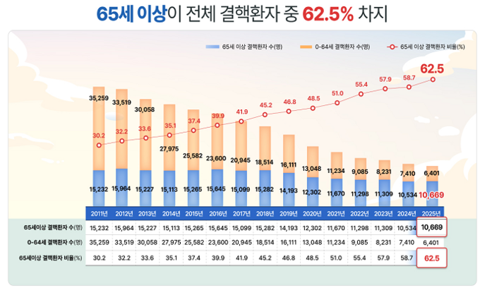 65세 미만 환자는 지속 감소하는 반면, 고령층 환자 수는 인구 증가 영향으로 소폭 증가하는 양상을 보이고 있어 고령층 대상 선제적 관리가 핵심 과제로 부상하고 있다.