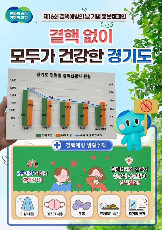 27일 도에 따르면 2025년 기준(잠정) 결핵환자는 전국의 경우 1만7,107명(33.5명/10만명 당), 경기도는 3,717명(27.3명/10만명 당)으로 집계됐고, 65세 미만 연령대에서 2021년 전체환자는 2,964명에서 2025년 1,628명으로 45.1% 줄었으며, 신환자(과거에 결핵치료를 받은 적이 없거나 치료기간이 1개월 미만인 자)는 같은 기간 2,381명에서 1,360명으로 42.9% 감소하는 성과를 나타냈다.