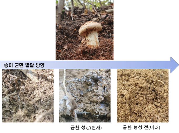 이번 연구는 경북 영주시의 송이 발생지에서 송이 균사가 원형으로 퍼져 나가는 ‘균환(Fairy-ring)’의 발달 단계를 세 단계로 구분해 진행됐으며, 송이가 발생한 토양, 균환 생장이 활발한 토양, 균환 형성 이전 토양으로 나누고, 사계절에 걸쳐 토양 변화를 정밀 분석했다.