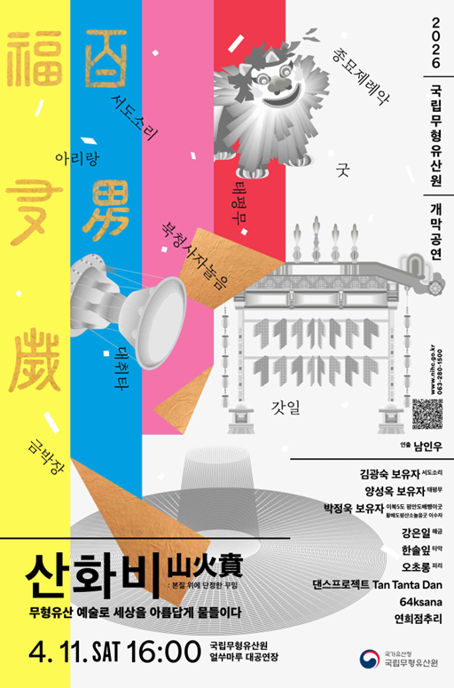 [뉴시니어 = 노태영 기자] 국가유산청(청장 허민) 국립무형유산원(원장 박판용)은 2026년 개막공연 산화비, 무형유산 예술로 세상을 아름답게 물들이다를 오는 11일 오후 4시, 전북 전주 국립무형유산원 얼쑤마루 대공연장에서 개최한다고 밝혔다.