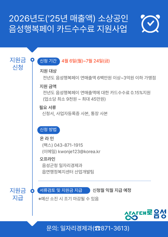 지원 대상은 공고일 기준 사업장 소재지가 음성군인 음성행복페이 가맹점 중 2025년도 음성행복페이 연매출액이 6백만원 이상~3억원 이하인 소상공인으로 금액은 지난해 음성행복페이 연매출액에 대한 카드수수료 0.15%에 해당하는 금액으로 1개 업체당 최대 45만원까지 지원된다.