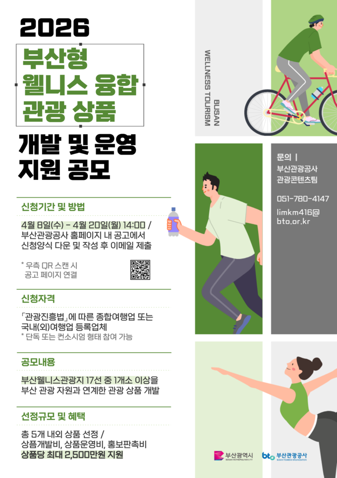 [뉴시니어 = 노태영 기자] 부산시(시장 박형준)와 부산관광공사(사장 이정실)는 부산 웰니스 관광자원을 활용한 융합 관광상품 개발과 글로벌 시장 진출을 지원하기 위해 부산형 웰니스 융합 관광상품 개발 및 운영 지원 공모를 오는 20일까지 실시한다.