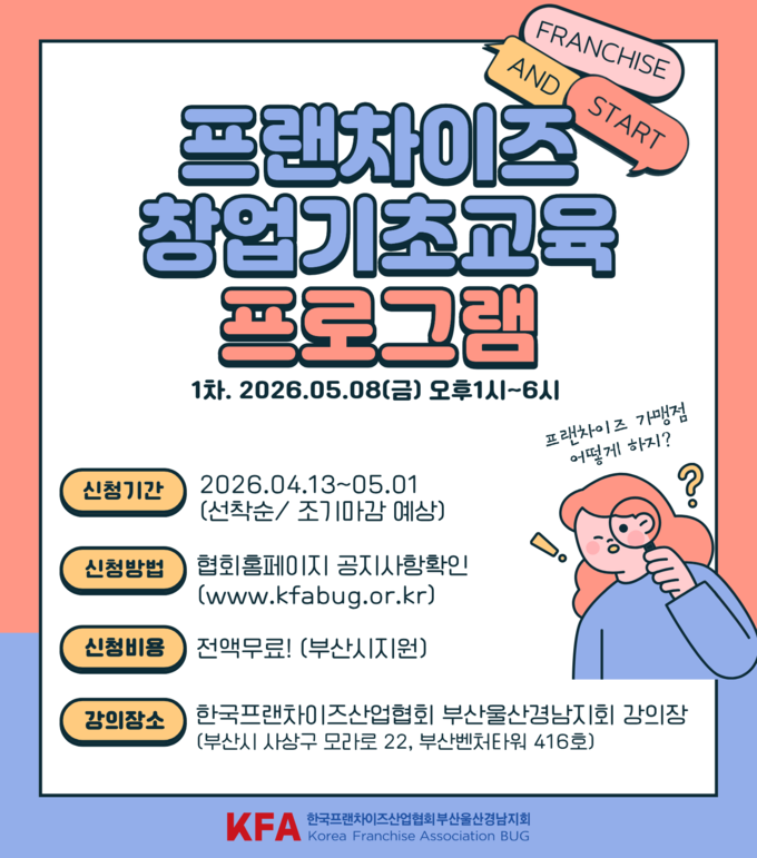 교육 대상은 프랜차이즈 가맹점 창업에 관심 있는 시민 누구나이며, 1차 교육생은 5월 1일까지 모집한다. 신청은 한국프랜차이즈산업협회 부산울산경남지회 누리집을 통해 가능하며, 선착순으로 최대 80명을 선발한다.