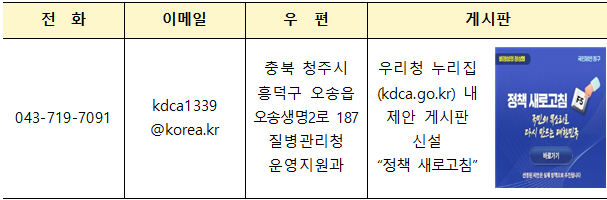임승관 청장은 "질병관리청은 국민건강 보호라는 본연의 역할을 다하면서도, 그 과정에서 국민이 느끼는 불편과 불합리함을 외면하지 않겠다"며, "현장에서 직접 체감하는 작은 불편 하나라도 소중히 살펴 개선으로 이어지도록 하겠다"고 전했다.