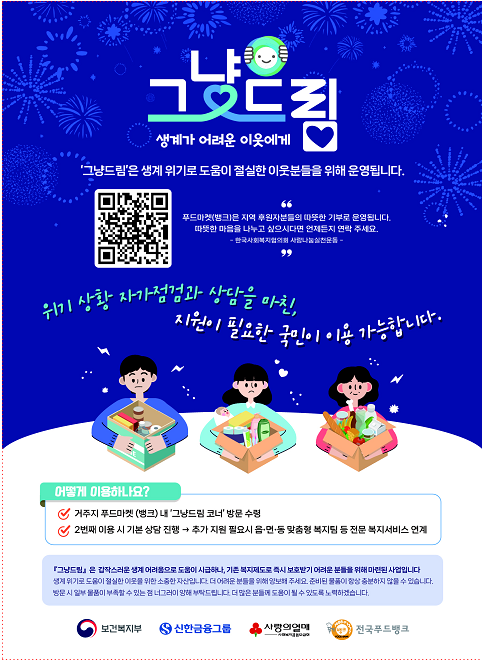 아울러 그냥드림 사업은 긴급 생계 위기 등으로 어려움을 겪는 국민이 별도의 복잡한 증빙 절차 없이도 식품과 생필품을 신속하게 지원받을 수 있도록 복지 문턱을 낮춘 사회 안전망으로 물품 지원 이후에는 상담과 복지서비스 연계를 병행하여 복지 사각지대를 해소하고 안정적인 생활기반 마련을 지원하고 있다.