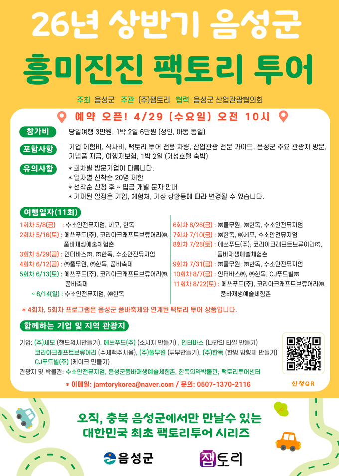 팩토리투어 예약은 29일 오전 10시부터 가능하며 상세한 정보와 예약 방법은 음성군 SNS와 음성군청 문화관광 누리집을 참고하면 된다.