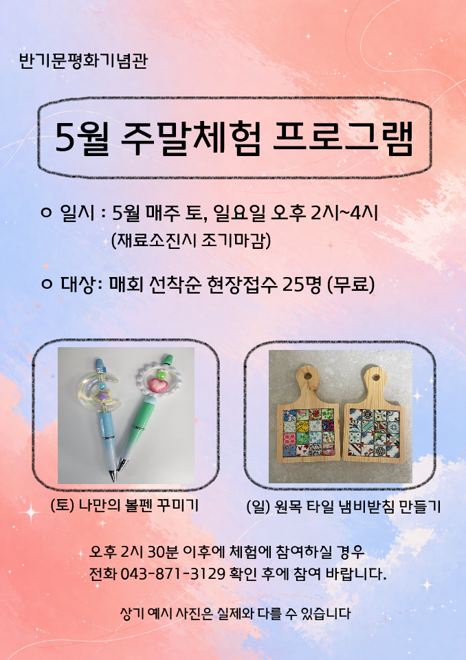 군 관계자는 “다가오는 주말, 반기문 평화기념관을 방문해 전시와 체험 프로그램을 함께 즐기고, 일상에서 사용할 수 있는 실용적인 작품도 만들어보는 뜻깊은 시간을 보내시길 바란다”고 전했다.