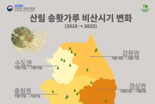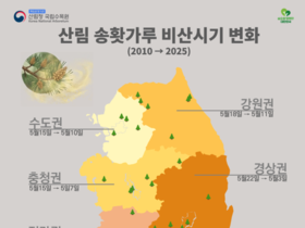 [뉴시니어 = 노태영 기자] 산림청 국립수목원(원장 임영석)은 소나무 화분(송홧가루) 비산 시기 변화를 분석한 결과, 기후변화의 영향으로 비산 시작 시점이 해마다 앞당겨지고 있는 것으로 나타났다고 23일 밝혔다. 이번 분석은 국립수목원을 포함한 전국 11개 수목원이 참여하는 ‘한국 식물계절 관측 네트워크’의 자료를 기반으로 수행됐으며, 소나무 관측목이 있는 전국 산림 24개 지점에서 장기간 축적된 자료를 활용했다. 국립수목웍은 분석 결과, 2010년 이후 최근까지 소나무 화분 비산 시작일은 전국 평균 기준 매년 약 0.91일씩 앞당겨지고 있는 것으로 확인됐고, 이러한 변화는 남부 권역에서 더욱 뚜렷하게 나타났으며, 지역 간 차이도 발생했다고 설명했다. 특히 이와 같은 결과는 기후변화에 따른 기온 상승이 식물의 생육 주기에 영향을 미치고 있음을 보여주는 사례로, 화분 비산 시기 역시 점차 앞당겨지고 있음을 시사한다고 전했다. 송홧가루는 인체에 직접적인 독성은 없으나, 알레르기 체질이 있는 경우 재채기, 콧물, 눈 가려움 등의 증상을 유발할 수 있으며, 비산 시기가 앞당겨짐에 따라 기존보다 이른 시기부터 건강 관리에 주의가 필요하다. 임영석 원장은 “소나무 화분